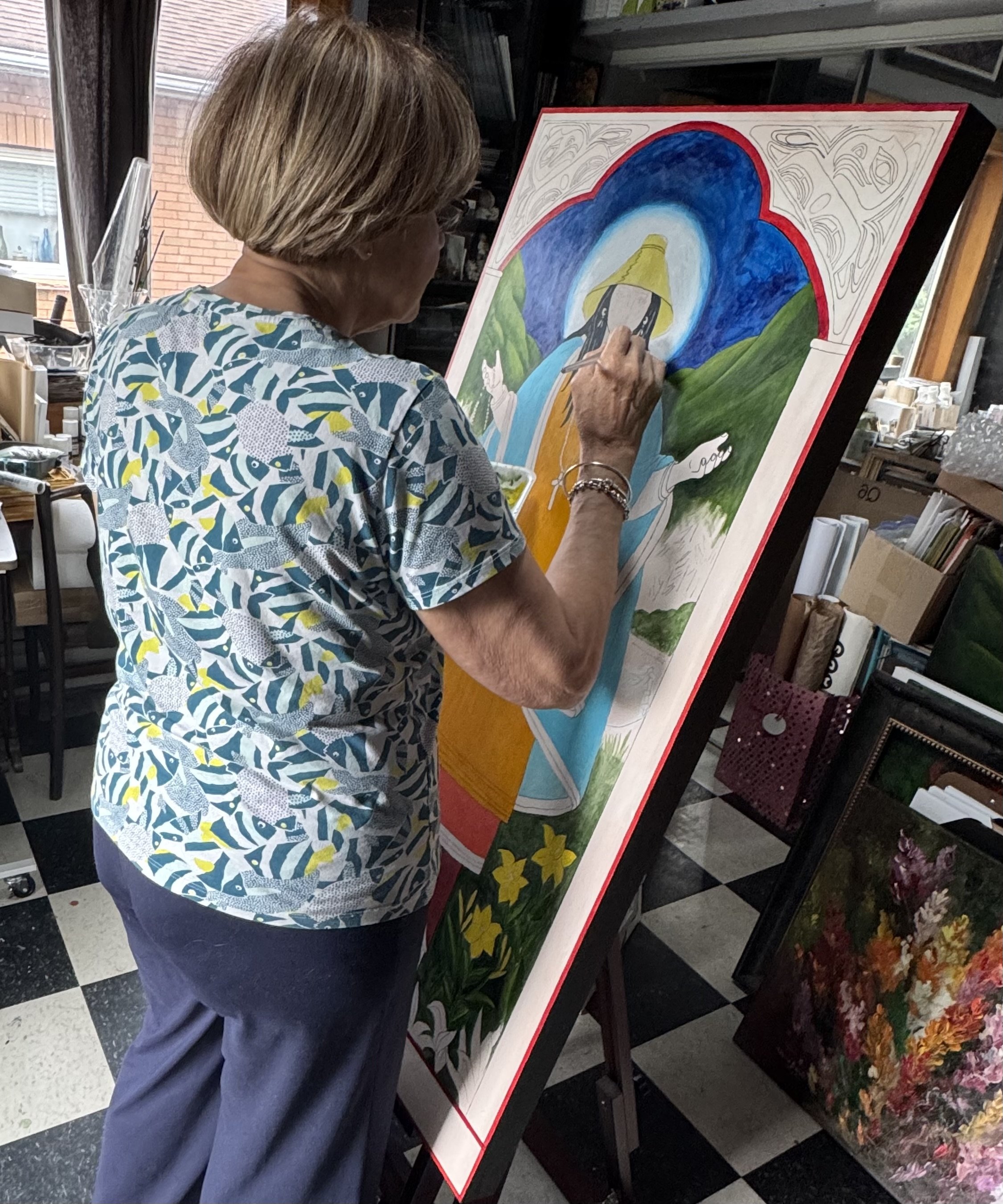 "Every time I come into my studio, I start with a prayer. I pray over my brushes. I pray over my paint. And, in the case of a saint, I pray to the saint," she said. "I ask the saint to guide me to select the colors that the saint would want, to put the saint in a setting where the saint would want to be, and I ask the saint to speak to my heart, tell my heart what you want my hands to do."