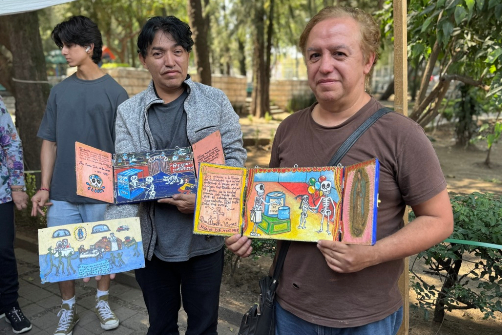 Vendors at a bazaar in Mexico City explain how they rescue ex-votos from trash bins behind churches. (GSR photo/Helga Leija)