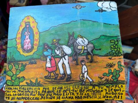 This ex-voto says: "Thank you, Blessed Mother, for allowing us to visit you, to dance for you, and to ask you to bless our family and to give us something more to eat than just beans. Mesa de Dolores, Mexico, May 28, 1951." (GSR photo/Helga Leija)