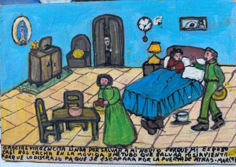 This ex-voto says: "Thank you, Blessed Mother, for saving my boyfriend because my husband almost caught us in the act, and my maid had to save me by distracting him so he could escape through the back door. March 1971." (GSR photo/Helga Leija)