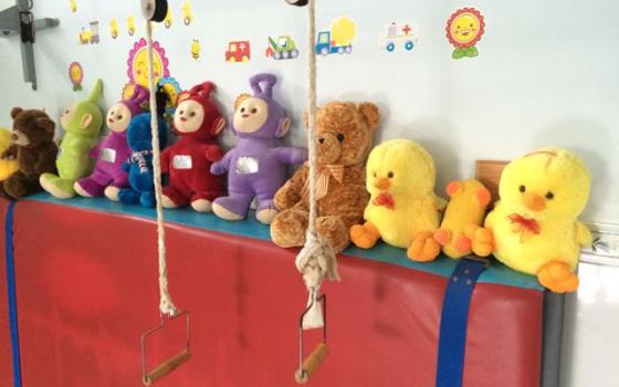 One room has exercise equipment along the walls; another room is padded so the children can move within it without injuring themselves; yet another is open and provides a breezy environment for naps and sleeping at night. A kitchen keeps the meals coming. A medical office allows volunteer physicians and nurses to check the children who are frequently taken to local hospitals for more serious care. Sr. Kim Chi says a lot of her time involves visiting the children at the hospitals.