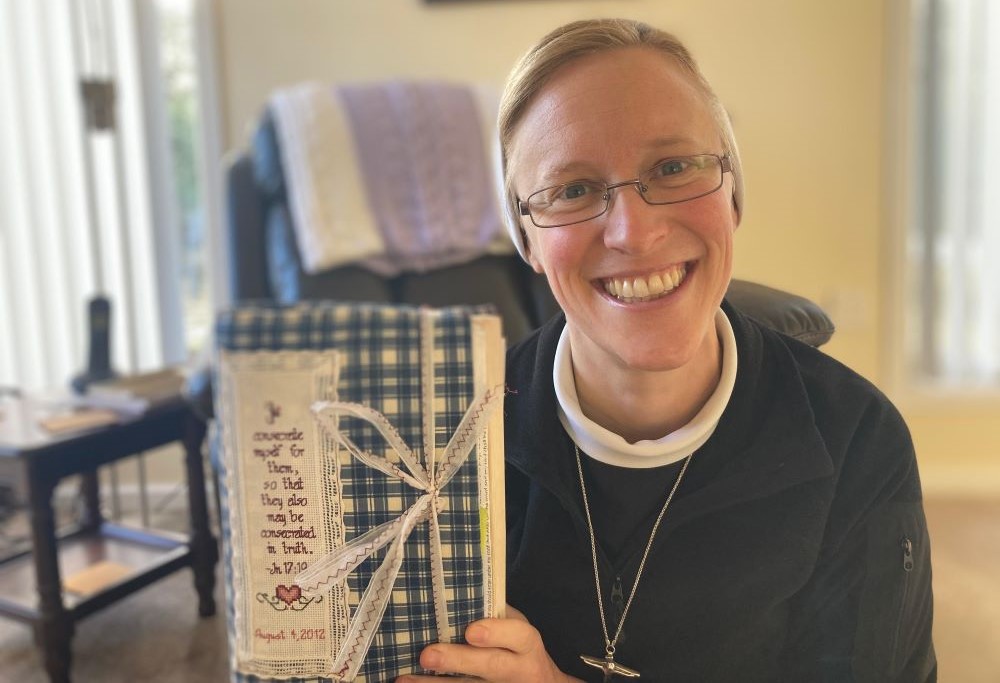 Sr. Kathryn Press displays her Bible from college. (Kathryn Press)