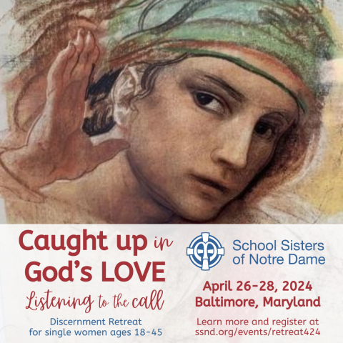 (February 8, 2024) – The North American Vocation Team (NAVT) of the School Sisters of Notre Dame (SSND) invites single women ages 18-45 to a discernment retreat April 26-28, 2024, at Villa Assumpta in Baltimore, Maryland. More information and registration is available at ssnd.org/events/retreat424/.