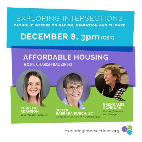 Join LCWR Region X for our next episode of "Exploring Intersections: Catholic Sisters on Racism, Migration and Climate" airing live at 3p.m. Central, Wednesday, December 15. Host Charish Badzinski and a panel of experts will discuss the challenges in addressing the needs of those, through no fault of their own and with nowhere to turn, who simply want and deserve a place to call home. You can also find the recording of this and past episodes on YouTube or your favorite podcast app. Registration is free and open to the public. To Register, visit: exploringintersections.org