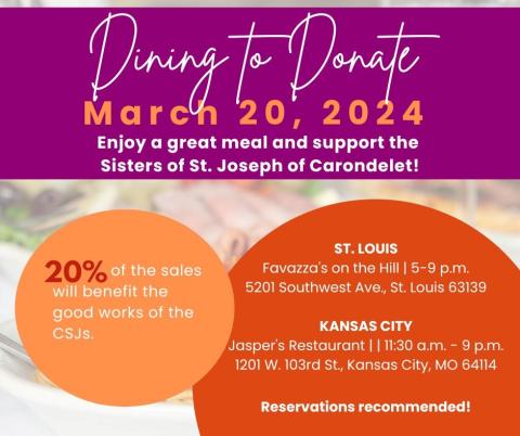 Dining to Donate returns! Enjoy a great meal at Jaspers and help support the Sisters of St. Joseph of Carondelet at the same time. 20% of sales will benefit the good works of the CSJs.