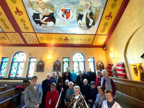 Sacred Heart Church in Glendale, NY, celebrated the longtime contributions of the Sisters of St. Dominic of Amityville to the parish with a special mural! On January 23, 2022, they hosted a blessing of a painting on the ceiling that features our founder St. Dominic de Guzmán and our patroness St. Catherine of Siena as well as the emblem of our Congregation. Sisters were delighted to attend. It was even covered in The Tablet Diocesan Newspaper!