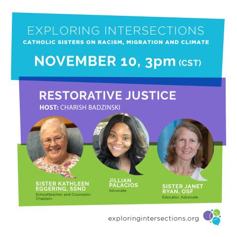 Join LCWR Region X for our next episode of “Exploring Intersections: Catholic Sisters on Racism, Migration and Climate”—airing live at 3 p.m. Central on Wednesday, November 10—with host Charish Badzinski and a panel of experts. You can also find the recording of this and all past episodes on YouTube or your favorite podcast app. Registration is free and open to the public.