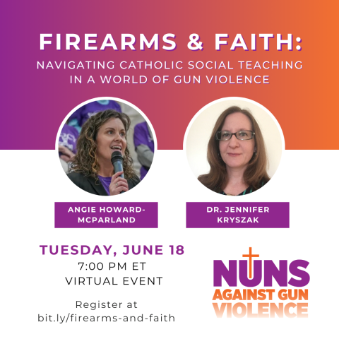 Nuns Against Gun Violence (NAGV) is pleased to announce a timely and critical webinar entitled "Firearms and Faith: Navigating Catholic Social Teaching in a World of Gun Violence." The webinar will be held via Zoom on Tuesday, June 18, at 7 PM ET.