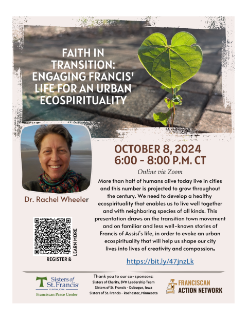 The Franciscan Peace Center is hosting a special webinar titled “Faith in Transition: Engaging Francis' Life for an Urban Ecospirituality” on October 8, 2024, at 6:00 PM CDT. This virtual event, held via Zoom, coincides with the Feast of St. Francis and explores the concept of urban ecospirituality. Dr. Rachel Wheeler, Associate Professor of Spirituality at the University of Portland, will present and facilitate a discussion on how the teachings and life of St. Francis of Assisi can inspire a renewed ecospirituality for urban living. The presentation will be followed by a Q&A session.