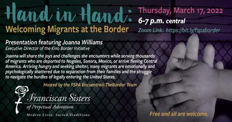 The Franciscan Sisters of Perpetual Adoration’s Encuentro@TheBorder Team is pleased to host Joanna Williams for a discussion about the current realities at the border. “Hand in Hand: Welcoming Migrants at the Border” is scheduled for Thursday, March 17, 6-7 p.m. central. Sister Katie Mitchell will host this online discussion via Zoom.