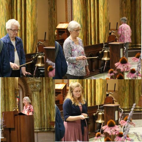 When the reading ended, 12 women came forward to ring the ceremonial bell 147 times—celebrating the 146 years completed and ushering in the new year. Bell ringers represented our sisters, affiliates, prayer partners and partners in mission on staff. Jean Amlaw served as bell ringer and represented our longest prayer partner in the group, having partnered with FSPA in prayer in 2002. For 27 years, FSPA has welcomed people from the La Crosse area to take at least an hour per week in prayer in our Adoration Chapel. Today we have more than 100 prayer partners praying with us.