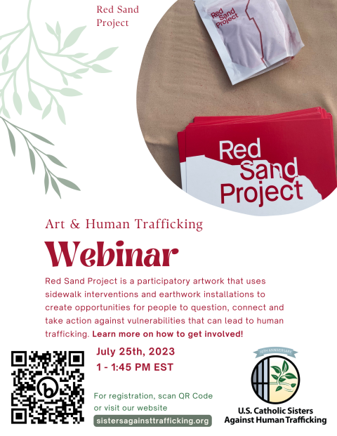 U.S. Catholic Sisters Against Human Trafficking is offering an opportunity for individuals, groups, or organizations to learn more about spreading awareness through its Human Trafficking & Art webinar on July 25 at 1 p.m. EDT. Founder Molly Gochman of Red Sand Project will share how sidewalk interventions and earthwork installations create opportunities for people to question, connect and take action against vulnerabilities that can lead to human trafficking. Click here: bit.ly/3JWsl7b to register and learn about this unique way to bring light to the crime of human trafficking.
