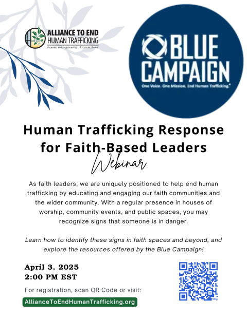Join the Alliance To End Human Trafficking for a discussion on April 3, 2025, at 2:00 PM EST for a free webinar designed specifically for faith-based leaders in partnership with the U.S. Department of Homeland Security Blue Campaign.