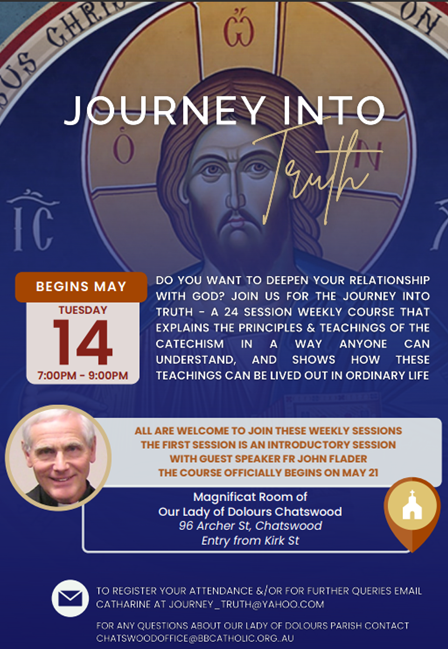 Journey into Truth is starting on the 14th of May at 7pm at Our Lady of Dolours Chatswood, Please see flyer for more information.