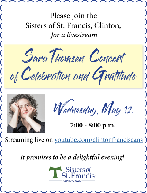 Please join the Sisters of St. Francis, Clinton, for a Livestream Sara Thomsen Concert of Celebration and Gratitude Wednesday, May 12, 7:00 - 8:00 p.m. Streaming live on youtube.com/clintonfranciscans