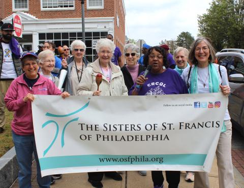 Over 20 sisters and companions represented the Sisters of St. Francis of Philadelphia and came to participate and show support, including local sisters from Aston and Chester, and two sisters who traveled from Baltimore to participate. Many sisters joined the caravan via the small Assisi House bus. It was a historic day for many of our sisters, since it was the first time that they were able to participate in an Environmental Justice March without having to physically march. The sisters on the bus were privileged when Ms. Zulene Mayfield, the march organizer, boarded the bus to thank the sisters for being there and for their prayers. Zulene is a resident of Chester who has been advocating for environmental justice since she started CRCQL in 1992. Marchers gathered across from City Hall, preparing for the two-mile walk to the Covanta Incinerator, also known as Delaware Valley Resource Recovery Facility. Local activists know it as the trash incinerator that is polluting the air and causing many health concerns, such as asthma, heart disease, cancer, and much more. Before the march began, Zulene gave her opening remarks. Following Zulene was Mayor Stefan Roots, who gave a speech pledging his support for the city and the fight for eco-justice. Then the group gathered in prayer, which reminded us how precious our Earth is.