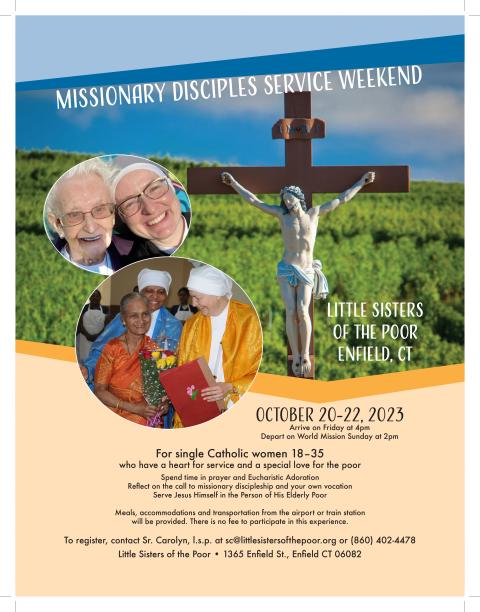 The Little Sisters of the Poor will be hosting a Missionary Disciples' Service and Discernment Weekend for single Catholic women 18-35 who are exploring religious life as a way to live out their personal call to be missionary disciples. Pray with the Sisters, serve the poor, and engage in discussion with other discerning young women about the call to missionary discipleship. There is no registration fee. Accommodations will be provided, as well as transportation to and from the airport or train station.