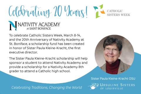To celebrate Catholic Sisters Week, March 8-14, and the 20th Anniversary of Nativity Academy at St. Boniface, a scholarship fund has been created by Nativity Academy in honor of Ursuline Sisters of Louisville Paula Kleine-Kracht, the first executive director.
