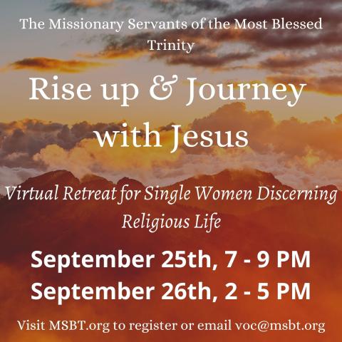 Are you interested in religious life? Want to discover your passion and hear the Missionary Servants of the Most Blessed Trinity share about serving others while in mission? MSBT Sisters invite single women, age 18+ that are discerning religious life to join them in a virtual discernment retreat. Perfect for those considering religious life, enjoy service and value faith sharing and reflection. To register go to https://www.msbt.org/rise-up-journey-with-jesus/ or email [email protected] for more information.