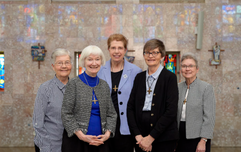 (July 18, 2024) – The Sisters of Notre Dame de Namur U.S. East-West Province (SNDdeN EW) announced its new Leadership Team, selected through a province-wide discernment process in April 2024, to fulfill the service of province governance. Members of the new team are Sisters Maria Delaney, Kathryn Keenan, Patricia O'Brien, Roberta Rzeznik and Virginia Scally, SNDdeN, who will serve for the next five years. This new Leadership Team transitioned on Friday, July 12, 2024, at a special celebration also marking the tenth anniversary of the East-West Province and the birthday of the foundress, St. Julie Billiart, who was born and baptized on July 12, 1751, in Cuvilly, France.