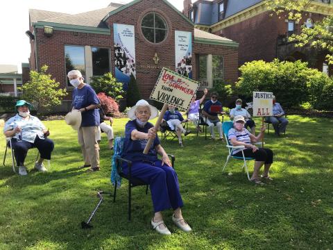 The Sisters were engaged in the news media coverage of the racism demomstrations around the country and wanted to show some sign of involvement. Yet they were very aware of COVID-19 safety guidelines. However, on Tuesday, June 9, 2020 the communitty of the Sisters of St. Mary decided to gather in the driveway and over onto the front lawn of the Sisters of St. Mary Center for a peaceful home protest. The Center is located on a residential street on the westside of Buffalo, NY. The Sisters carried signs that read, "Love is stronger than Violence", "Against Racism", "Black Lives Matter". People from the neighborhood wandered over to chat. Cars passed by and some honked their horns or waved as a sign of sharing their messages. Young people rode by on bikes and stopped to chat. In short, the neighborhood response was supportive and the Sisters made many new friends that afternoon.