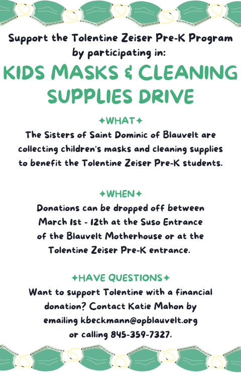 The Sisters of Saint Dominic of Blauvelt are collecting children’s masks and cleaning supplies to benefit the Tolentine Zeiser Pre-K students in the Bronx, NY.