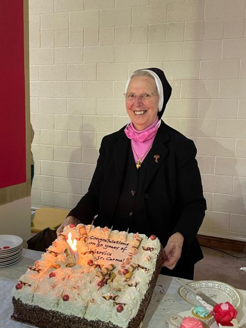 Father Hugh composed and recited a poem highlighting Carmel’s many contributions to the life of the parish of Neilstown. This tribute was followed by video messages from members of Sr. Carmel’s family and friends and from Fr. Damien Farron, who once served in the parish but is now chaplain for the Irish peacekeeping mission in Golan Heights. At the close of the Mass, an elderly parishioner, Larry Moore, who receives lots of TLC from Sr. Carmel, presented her with a chalice. She was delighted with this precious gift as she had mentioned several times that the parish badly needed a new chalice. While the parishioners lined up to offer their congratulations and thanks to Sr. Carmel, all were invited to coffee, tea, and pastries at the rear of the church.