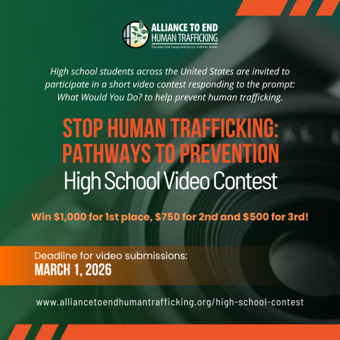 High school students across the United States are invited to participate in a short video contest responding to the prompt: “What Would You Do?” to help prevent human trafficking. These videos will highlight potential human trafficking scenarios chosen by the students, and result in raising awareness, educating, and empowering students and others on how to identify and prevent human trafficking. The video can be created by a group, individual or class and must be under 3 minutes in length.
