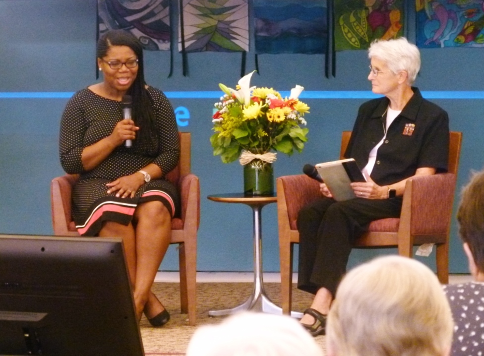 Dr. Shannen Dee Williams, left, answers questions posed by Dominican Sr. Gene Poore from the audience during an interactive webcast presentation August 5, 2017, with the Dominican Sisters of Peace. (Courtesy of Shannen Dee Williams)