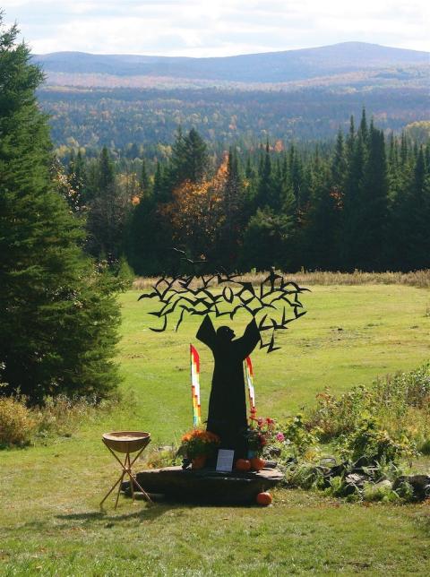 A sculpture of "St. Francis and the Birds" was made by the late artist Frederick Franck in honor of Thomas Berry and looks out from Green Mountain Monastery to the mountains of Greensboro, Vermont. (Courtesy of Green Mountain Monastery)