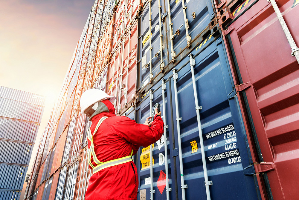A seafarer checks containers in this photo illustration. Seafarers are responsible for delivering most food, medicine, and electronics around the world, but disembarking at most international ports has become an impossibility. (Courtesy of Solidarity with Seafarers)