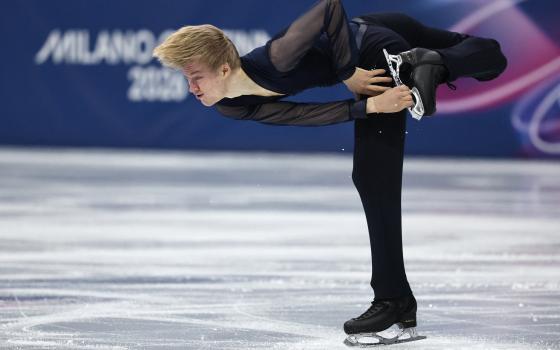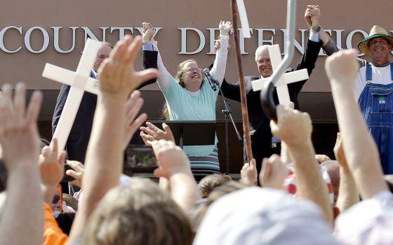 During their commissioning Aug. 17 Mass in Worcester, Massachusetts, Assumption Mission Associates carried their canvases with their mantras to the altar as the gifts were brought up. The author is pictured third from the left, with the mantra "Pay attention." (Provided photo)
