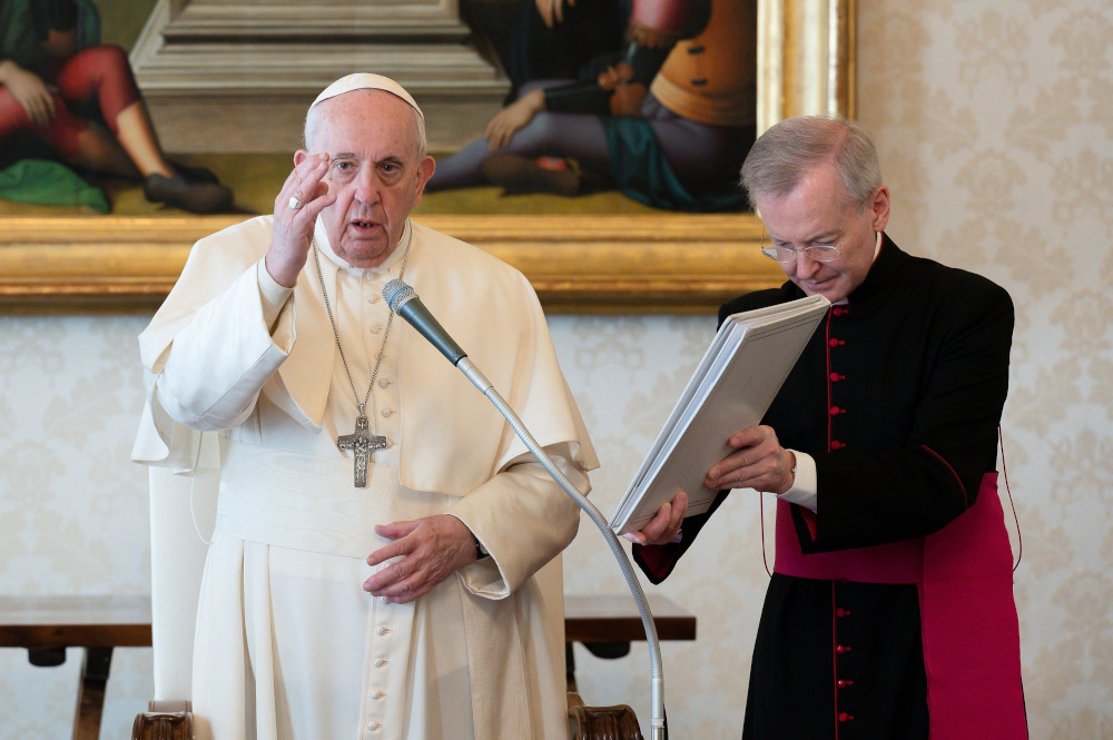 Pope Francis delivers his blessing as he leads his general audience in the library of the Apostolic Palace at the Vatican March 17, 2021. (CNS/Vatican Media)