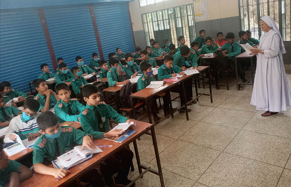 Shanti Rani Sr. Pierina Cecilia Das teaches students at St. Francis Xavier High School in Balubari, Dinajpur, Bangladesh. (Sumon Corraya)