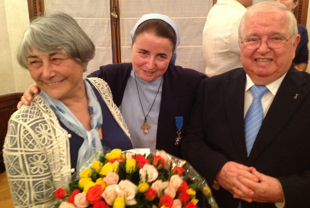 Sr. Sophie de Jésus with her parents, Christiane and Georges Renoux, after she received France's National Order of Merit in 2013. In 2015, she received the Legion of Honor for ACAY's programs in the Philippines and France. (Courtesy of Sr. Sophie de Jésus)