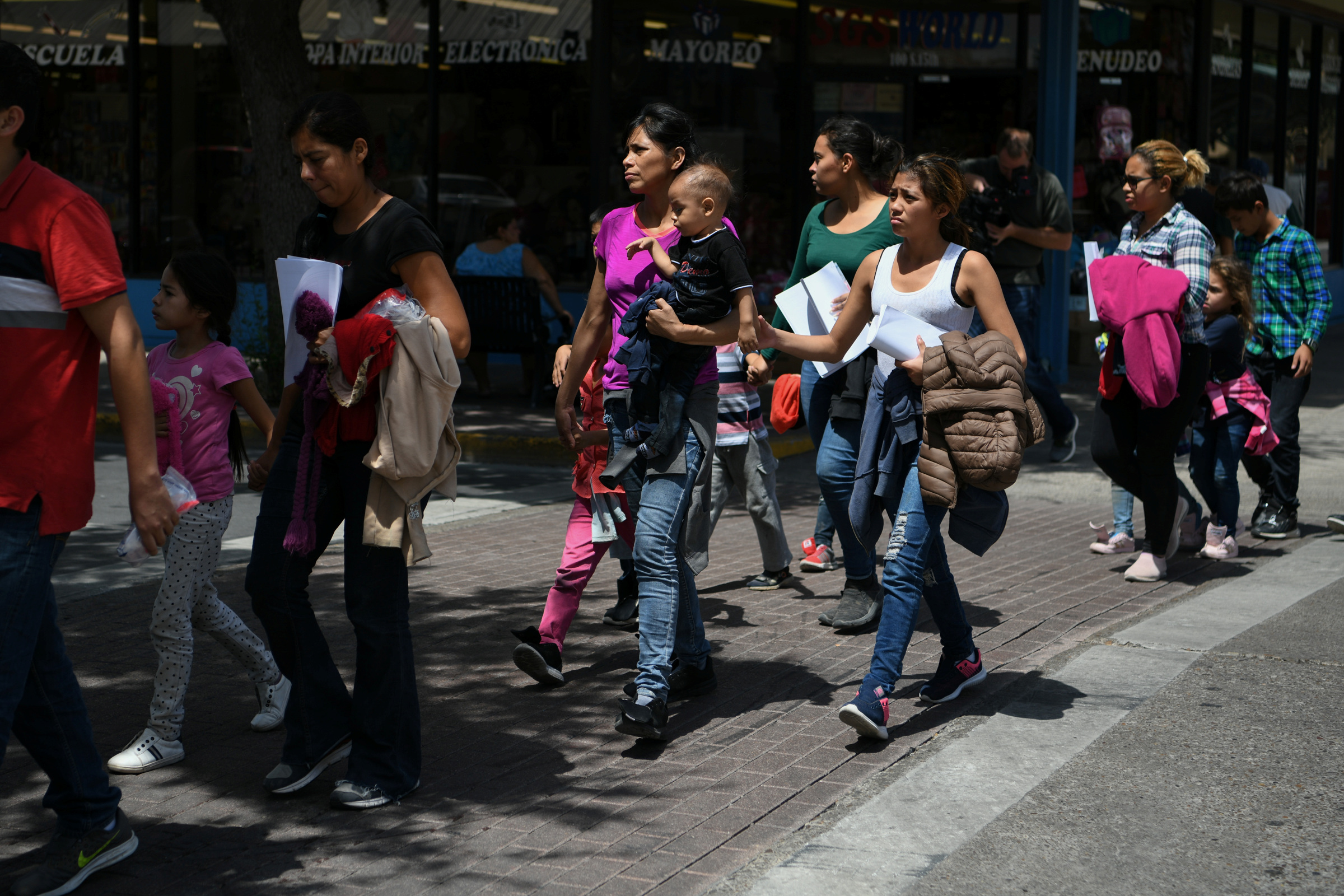 Migrant families seeking asylum walk from a bus depot to a Catholic Charities humanitarian respite center just after being released from federal detention in McAllen, Texas, July 31, 2019. (CNS photo/Reuters/Loren Elliott)