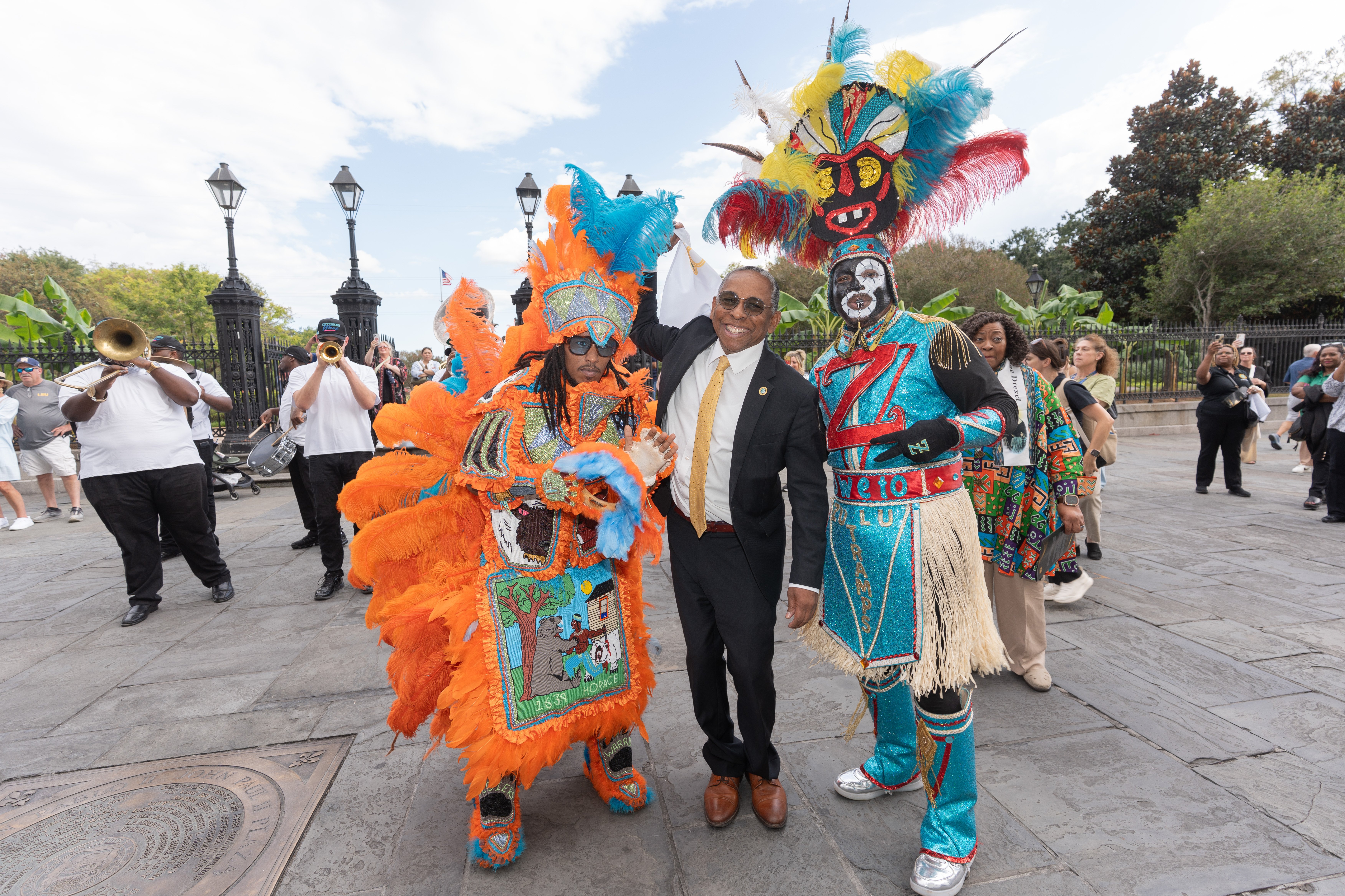 Reynold Verret, president of Xavier University of Louisiana in New Orleans, poses with members of the masking community following the centennial Mass for the university at St. Louis Cathedral in New Orleans Oct. 1, 2025. Community members are African Americans known for their elaborate outfits and participation in Mardi Gras. Their aesthetic is an expression of their culture, religion and spirituality. (OSV News/Courtesy Xavier University of Louisiana/Gavin Goins)