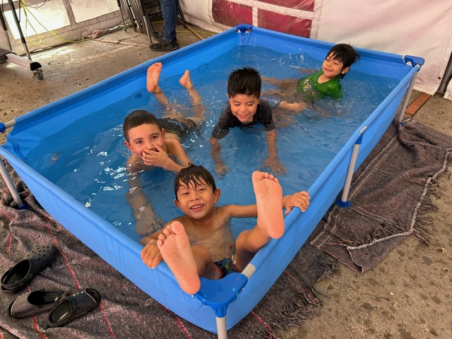Children cool off in a plastic pool donated by California nonprofit Border Compassion to the Cobina Posada del Migrante shelter in Mexicali, Mexico, where temperatures reached 120 degrees July 8. (Courtesy of Border Compassion)