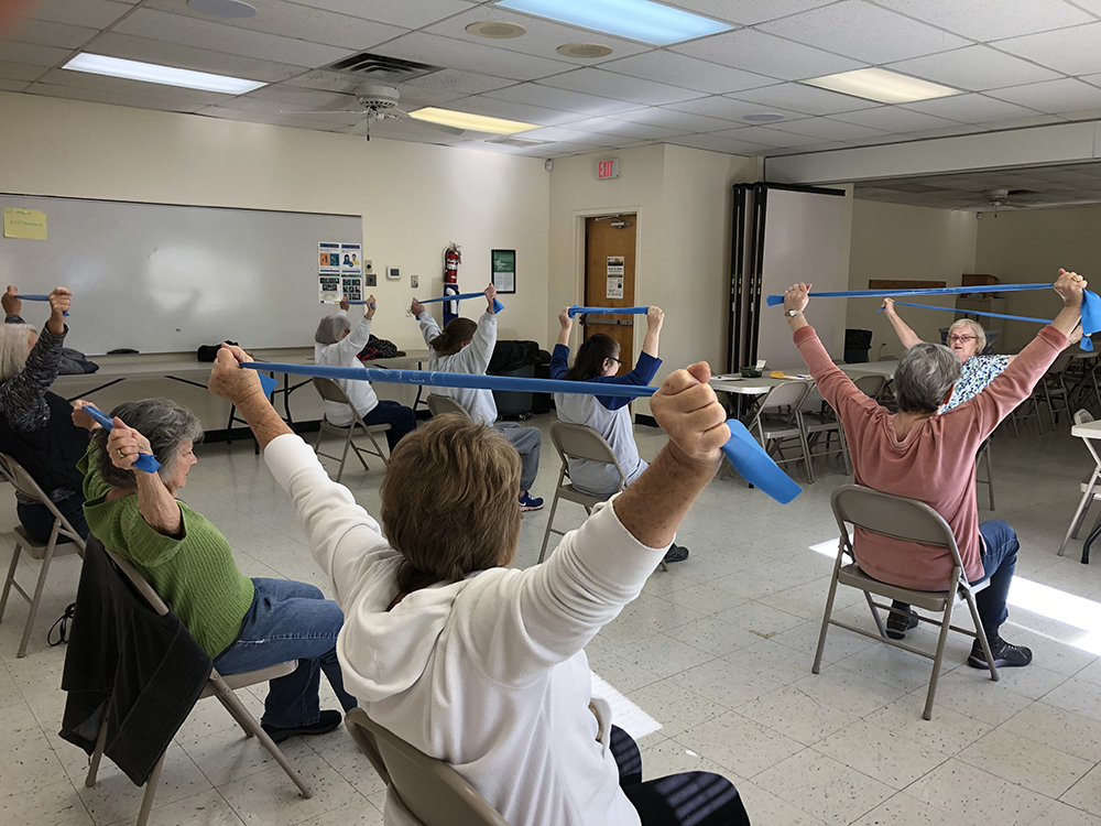 Sr. Loretta Spotila, a member of the Sisters of Charity of St. Augustine, who is the founder of the Interfaith Wellness Ministry in Estill County, Kentucky, back right, is pictured in an undated photo leading a fitness class. (OSV News/Courtresy of Sr. Loretta Spotila)