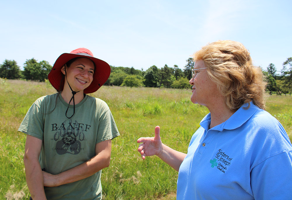 Sr. Karen Burke, the coordinator of land initiatives for the Sisters of St. Joseph, Brentwood, right, speaks to Amanda Furcall, the campus' landscape ecologist. Furcall said she is heartened by the return of foxes and box turtles to the land and said working with the sisters has given her a greater appreciation for the connection between Earth and spirit. "The sisters like to say, 'All is one,' and that's the basis of ecology." (GSR photo/Chris Herlinger)