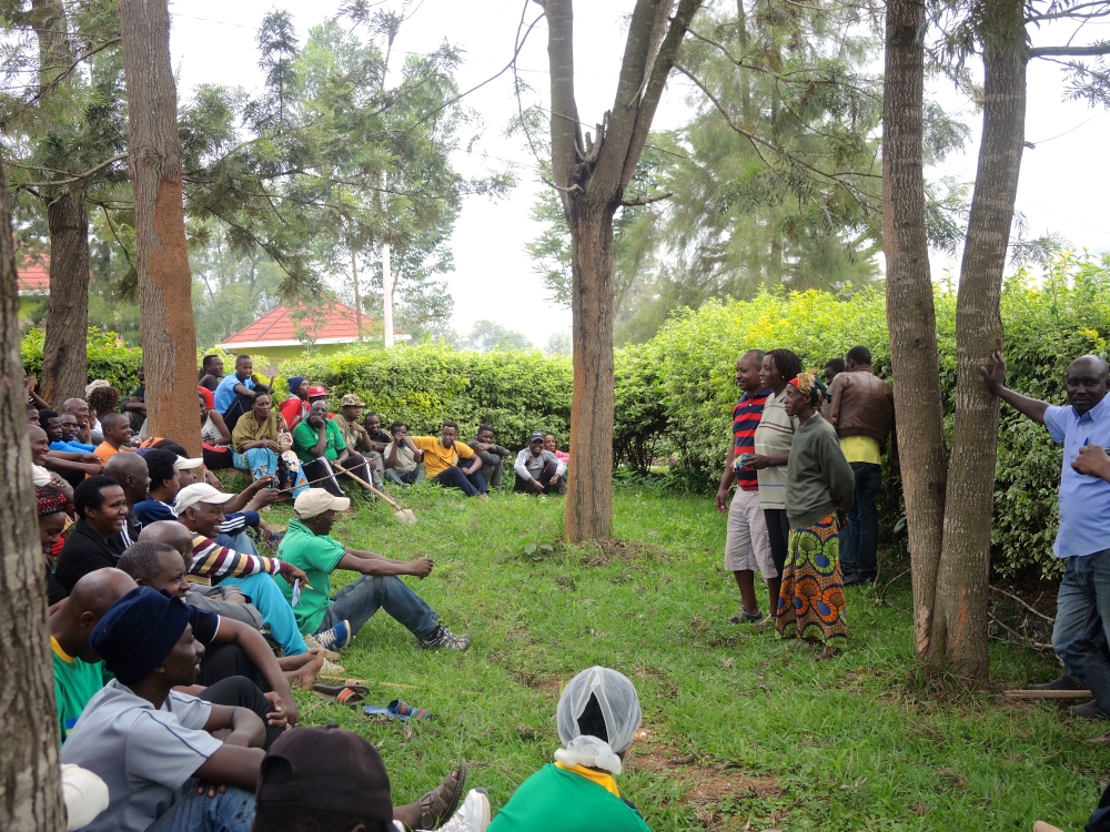 After three hours of weeding and pruning under the sun, the people of Kimana neighborhood were ready to start their meeting. They slipped into a shaded grassy area near the main road and signed in on the attendance sheet, sitting quietly as they waited for the meeting to begin.