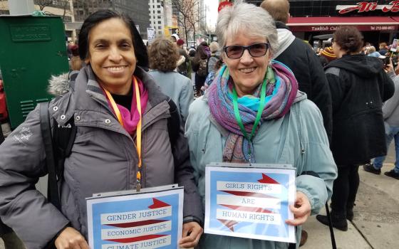 In New York, the Women's March was an extension of the day-to-day work for the Catholic sisters who represent their congregations at the United Nations. Sr. Winifred Doherty, the United Nations representative of the Congregation of Our Lady of Charity of the Good Shepherd, and Sr. Celine Paramunda, the U.N. representative of the Medical Mission Sisters, wore placards proclaiming their commitments to girls' rights and gender justice, economic justice and climate justice and to girls' rights.