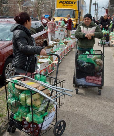 Neighbors prepare to take carts full of food home at the SSJ Neighborhood Center's monthly food distribution day, March 20 in Camden, New Jersey. (GSR photo/Dan Stockman)