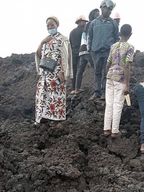 Sister Madeleine accompanies the teachers who lost their houses, which were covered by lava. She is standing on the still-hot ground. (Courtesy of Bernadette Mwavita/Ursuline Sisters of Goma)