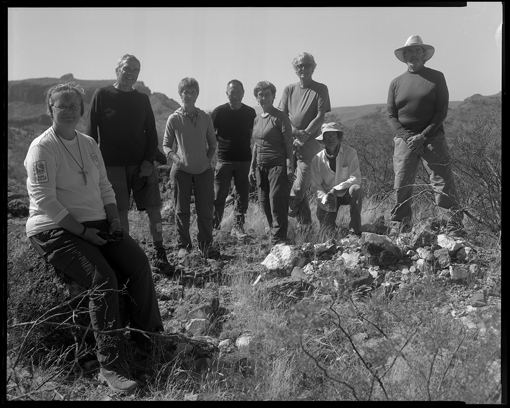 A group of Ajo Samaritans and volunteers pause for a moment before returning to Ajo town after spending half a day dropping off water and food for migrants in the Sonoran Desert of Arizona. From left are Sr. Maria Louise Edwards, Tom Zerkel, Stef Laverty, writer Peter Tran, Sr. Judy Bourg, John Orlowski, John Heid (kneeling), and Bob Hunkler. Founded in 2012, the Ajo Samaritans, who organized the day's work, respond to the death and disappearance of travelers by dropping water along migrant trails around Ajo. Their mission is to relieve suffering and prevent deaths of all persons regardless of immigration status. (Lisa Elmaleh)