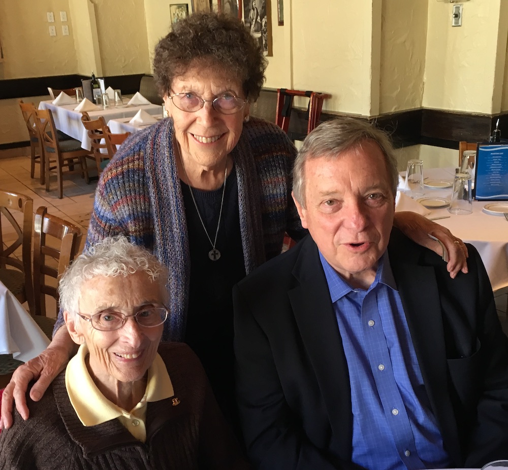 Mercy Sr. Pat Murphy, left, celebrates her 90th birthday on April 20, 2019, with Mercy Sr. JoAnn Persch and Sen. Dick Durbin, D-Illinois, in Chicago. (Courtesy of JoAnn Persch)