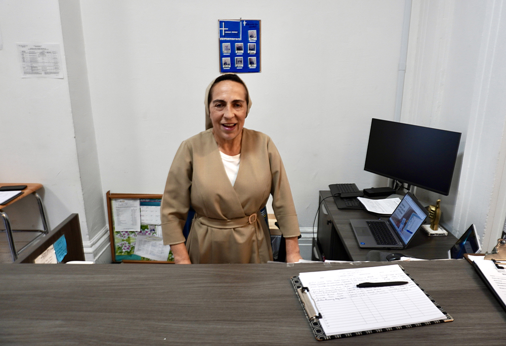 Sr. Martha Lopez is pictured working at the front desk of the resource fair sponsored by Catholic Charities of the Archdiocese New York, at St. Teresa's Church in Manhattan's Lower East Side, in July 2024. (NCR photo/Camillo Barone)