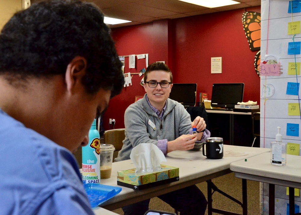 Troy (not his real name), left, is a client at YMCA Safe Place Services in Louisville, Kentucky, where Providence Sr. Corbin Hannah, right, is youth development coordinator. (GSR file photo)