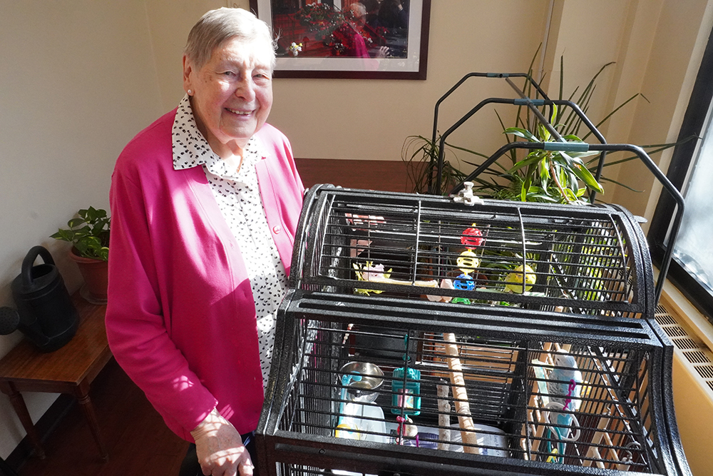 Sr. Marie Louise Vernimmen, 90, a retired nun and resident at The New Jewish Home, Kittay Senior Apartments since 2015, taking care of the Belle and Romeo, the parrots of the home on Dec. 13, 2024. (NCR photo/Camillo Barone)