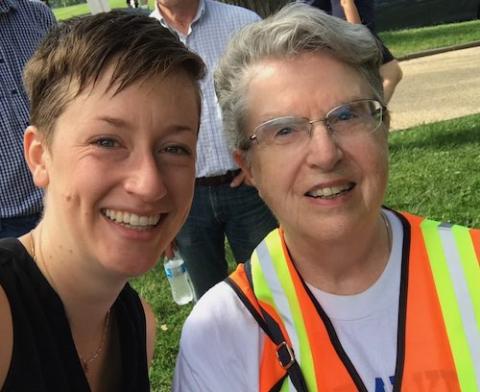 Brittany Koteles, left, co-director of Nuns and Nones, takes a selfie with Immaculate Heart of Mary Sr. Joan Mumaw at a 2019 demonstration against the treatment of immigrants at the border. "The whole thing was a literal embodiment of sisters helping us find our way in this fight," Koteles said. "There Joan was, literally showing me the way with her marshal flag, but also, supporting me to show up in the generations-long fight for justice from a place of spiritual groundedness and love for the world." (Provided photo)